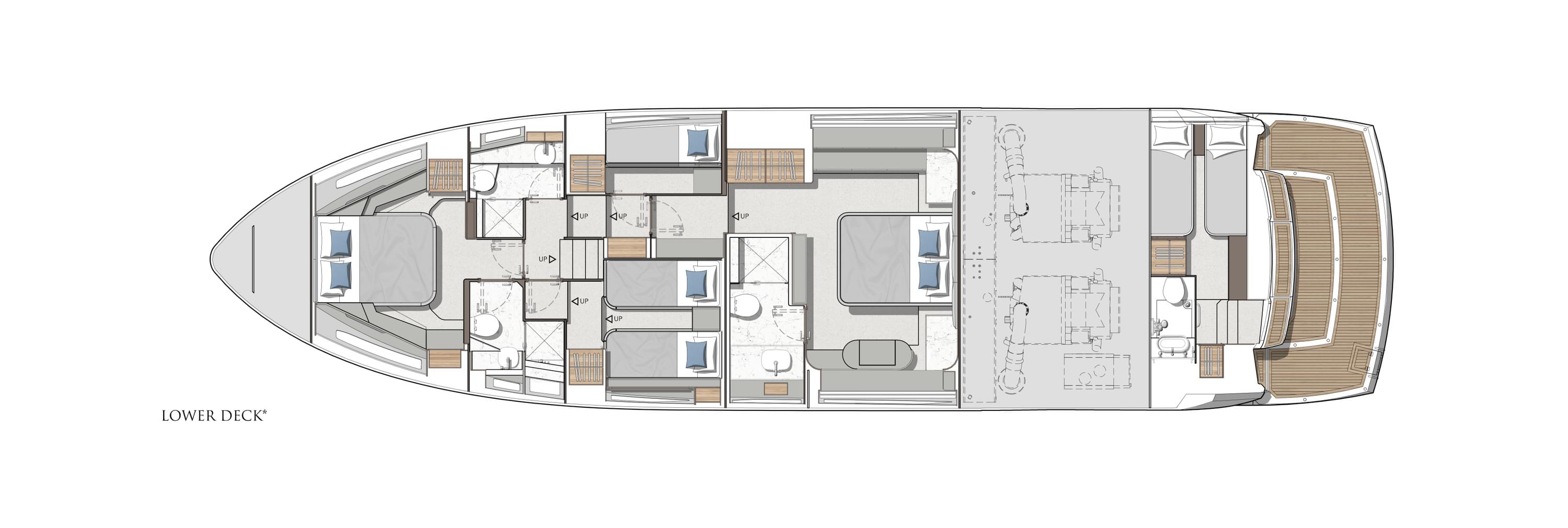 Design Unlimited has created options that tailor to any owner’s lifestyle, with the Manhattan 68 now offering configurable interior layouts, providing unmatched versatility. This yacht can be a 4-cabin layout with a private staircase leading to the owner’s midships full-beam cabin. Alternatively, it can be configured with a single staircase to cabins, creating space for an opposing seating group in the main saloon. This layout offers flexibility for a 3-cabin configuration with a grander entrance to the owner’s cabin, complete with an office, or it can include a Pullman-style 4th cabin. Whatever the preference, the Manhattan 68 adapts effortlessly to owner’s needs, ensuring comfort and functionality at every turn.