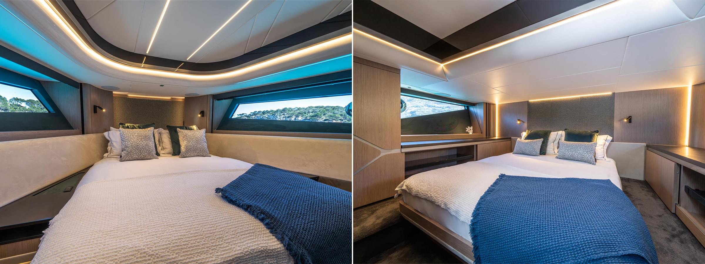 With use of space being the most important feature on board, the bow does not disappoint. Accessed via stylish pantograph doors to port and starboard of the helm, the side decks deliver effortless walk-around contact. The bow features a large sunbathing pad which can slide forward and aft to reveal an additional seating arrangement with table – making this a multi-purpose space for guests to enjoy throughout the day and night.