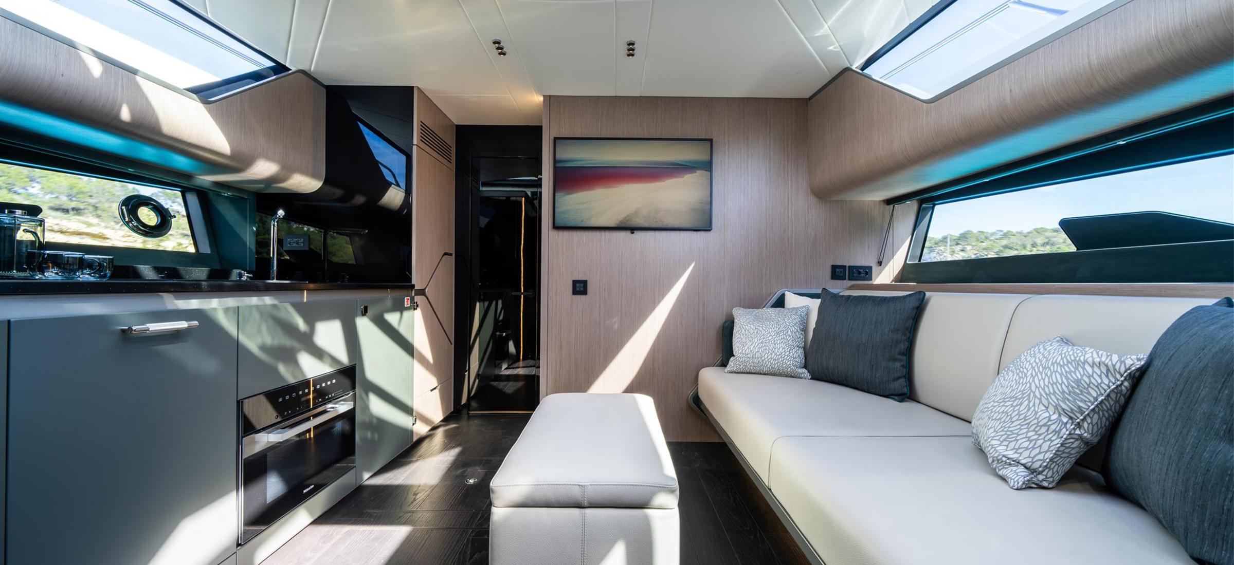 Firstly, let’s talk about the main deck arrangement. Perfect for entertaining with friends, the full-beam aft cockpit makes maximum use of the yacht's incredible width, benefitting from a generous configurable seating arrangement. With both forward seat units on adjustable rails, both sofas can glide effortlessly from an open, more relaxed position, diagonally inward to a more formal dining arrangement. Centred around a foldable table capable of seating up to 6 people comfortably, this feature allows owners to fully maximise the space on-board to suit their requirements.