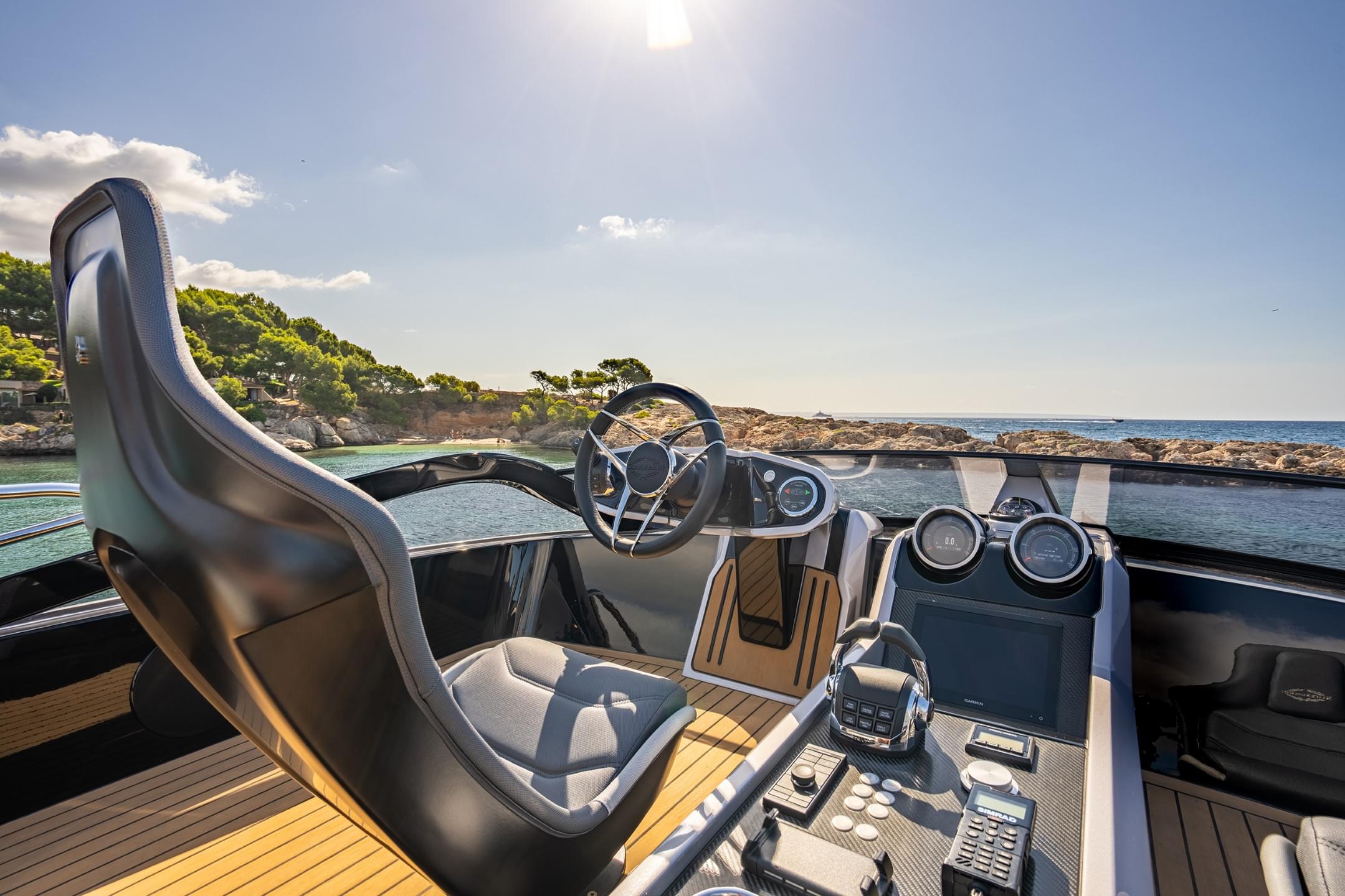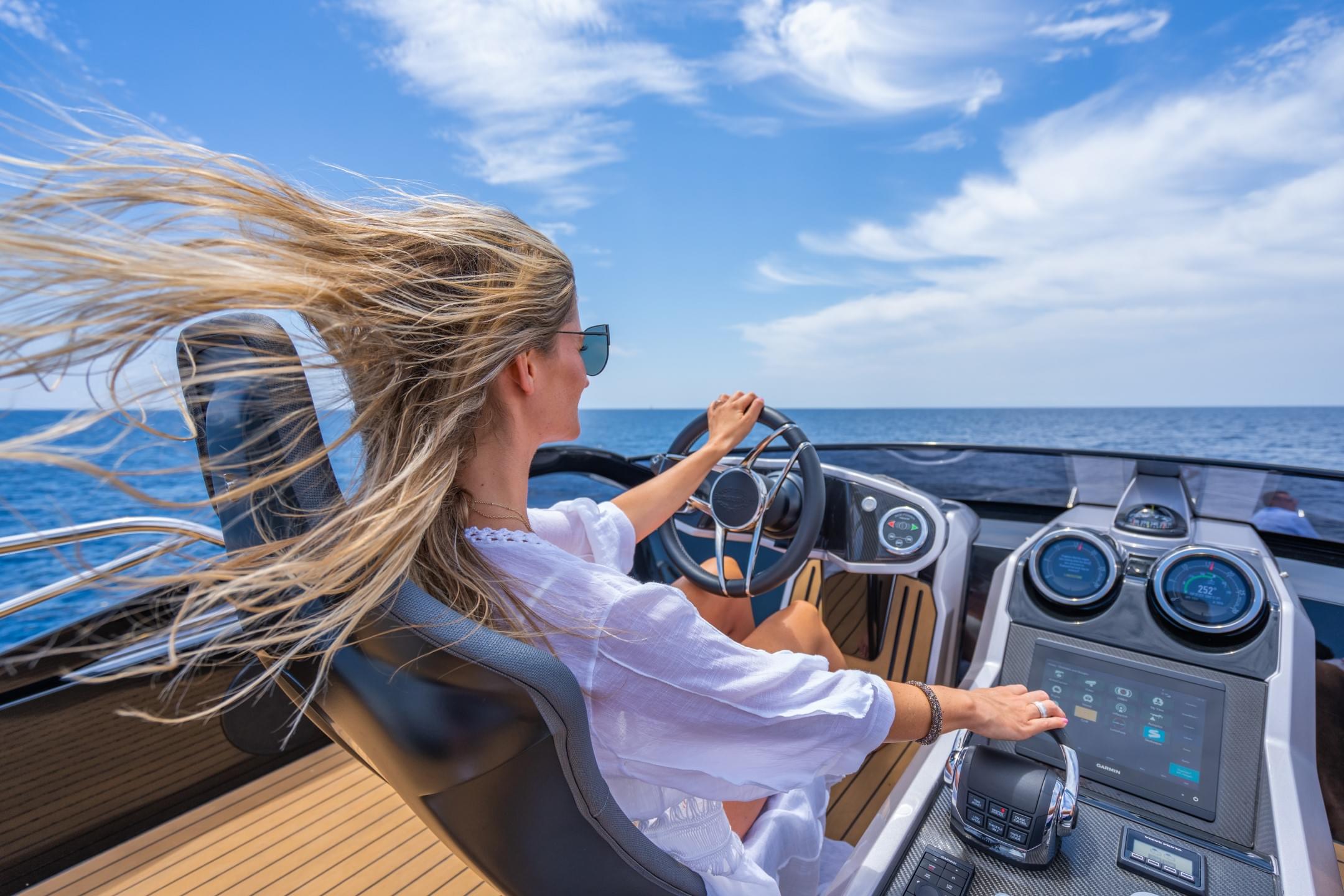 Inspired by the latest designs in automotive, the 65 Sport Yacht re-defines excitement in leisure boating. The specially designed SkyHelm™ features twin bolstered seats set very low on either side of a carbon fibre central console and the instrumentation is courtesy of a state-of-the-art glass bridge plotter complete with retro chrome dials housing LED displays. The user experience is one of pure adrenaline, akin to driving a high-performance convertible supercar, with acceleration to match.