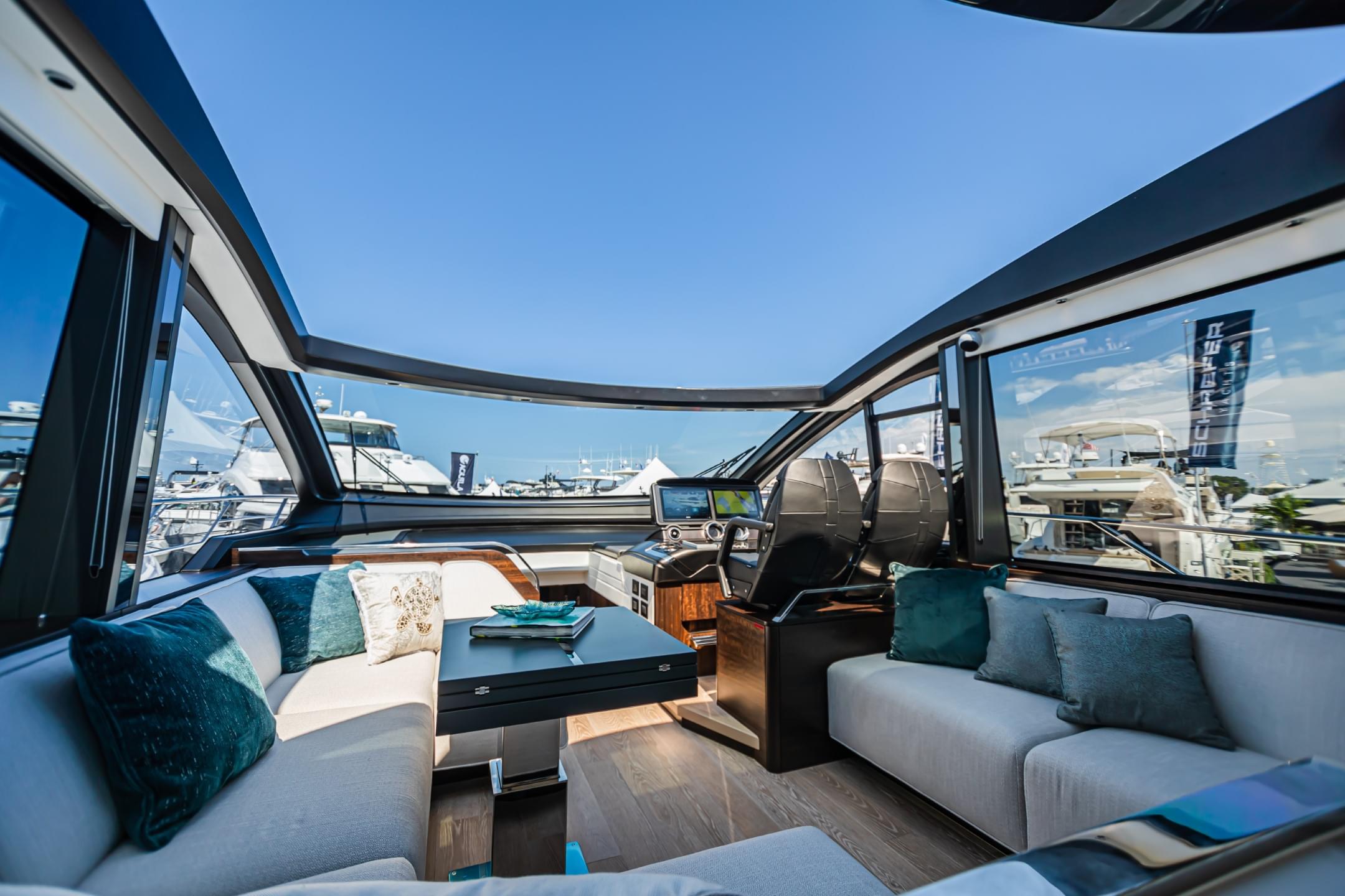 The Sunseeker Predator 65 shines under the Palm Beach sun in stunning new photography. Showing off the impressive carbon fibre sunroof in its open and closed position, the spacious and bright Predator 65 interior was brought sharply into focus. The retractable sunroof is complemented by an impressive double-curved single-piece windscreen and large windows to port and starboard, providing uncompromised views from within the interior space.