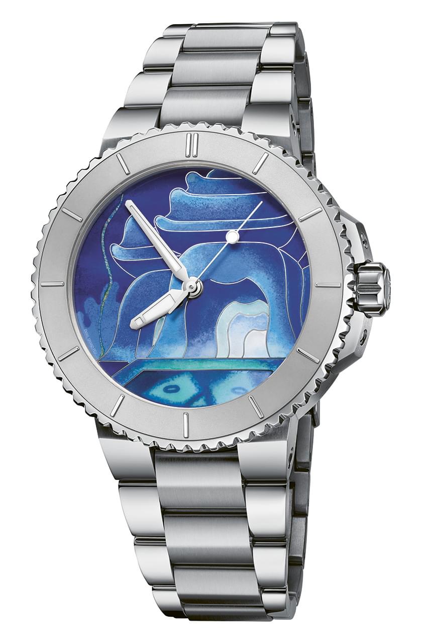 When it comes to diver watches, the Sun Wukong Artist Edition of the Oris Aquis costs ten times as much as other watches in the range, thanks to its hand-painted cloisonné enamel dial depicting an underwater scene inspired by Chinese animated film The Monkey King. And while it boasts water resistance up to 300m below the ocean’s surface, the lack of indices on the dial mean it would not pass the required ISO 6425 standards for a diver’s watch. Still, it is beautiful.